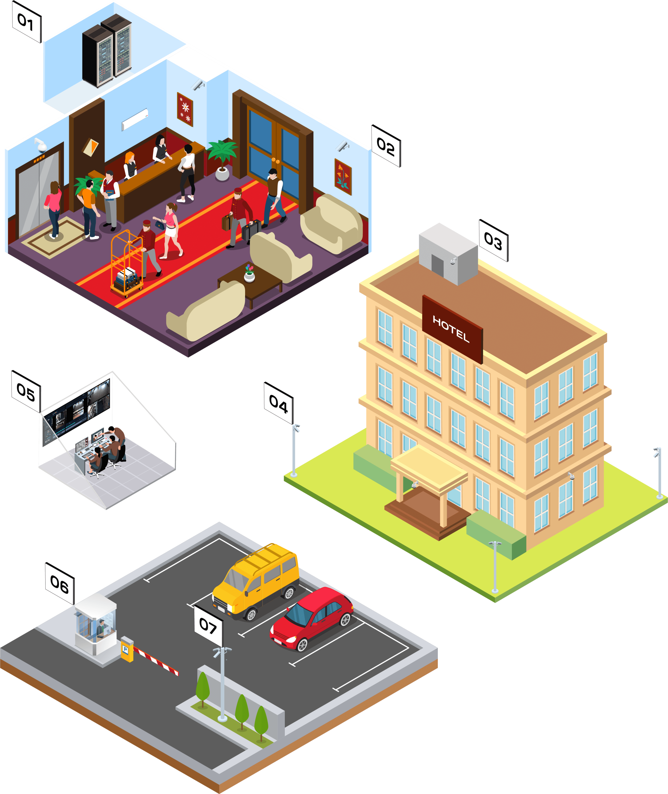 Cameras are installed exclusively in public and operational areas: receptions, lobbies, corridors, lifts, car parks, restaurants, pool areas, gyms and perimeters. They are never placed in bedrooms, bathrooms or changing rooms. We comply fully with GDPR and all applicable local regulations, with every monitored area clearly signed in accordance with current legislation.