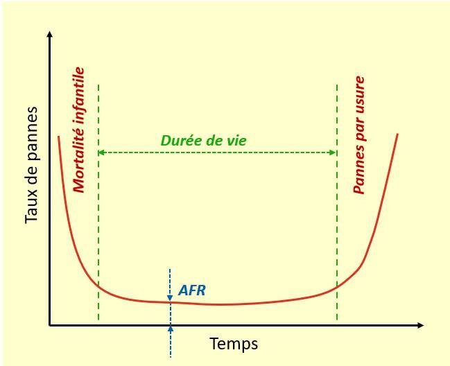 En termes de fiabilité, les appareils électroniques ont un certain niveau de « mortalité infantile » et après une période d’utilisation, les pannes surviennent en raison de l’usure. Le MTBF et l’AFR sont des valeurs valides pendant la durée de vie de l’appareil, c’est-à-dire qu’une fois la « mortalité infantile » passe (ce qui devrait survenir lors des procédures de déverminage de l’appareil en usine) et avant que des pannes ne surviennent en raison de l’usure (moment de remplacer l’appareil).